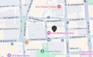 If you are driving to Baltimore, put the Lord Baltimore Hotel in your GPS at 20 West Baltimore Street, Baltimore, MD 21201.